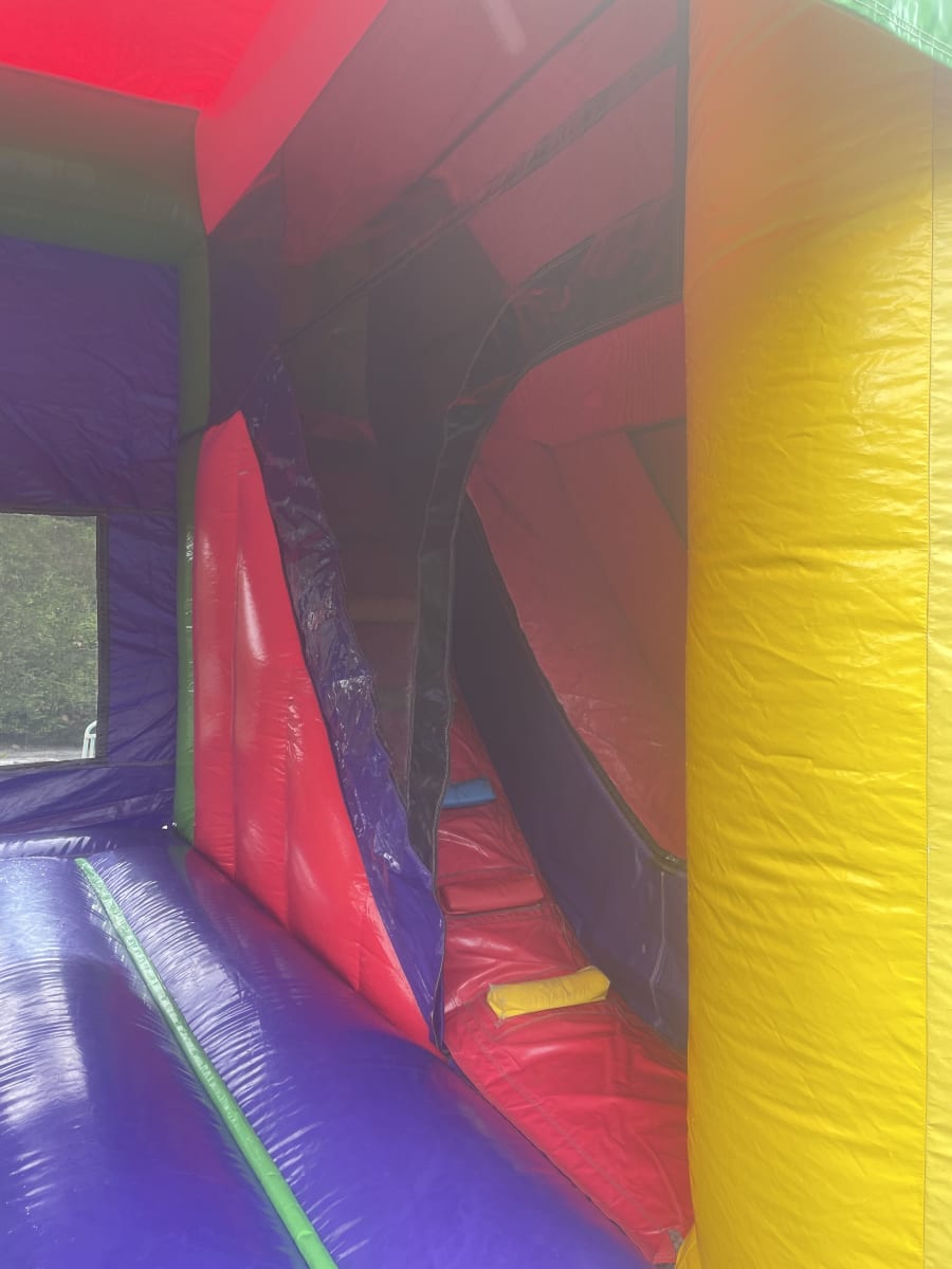 It contains a large bouncing area and an 8ft high slide. The top of the slide is accessed using internal steps.