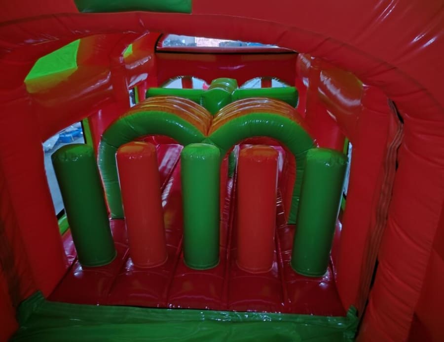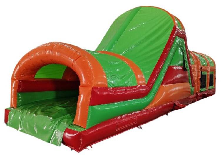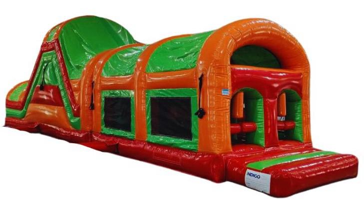 A double lane obstacle course. Children enter, negotiating their way through obstacles and tunnels.They reach a high climbing wall and exit down an 8.5m high slide at the other end.